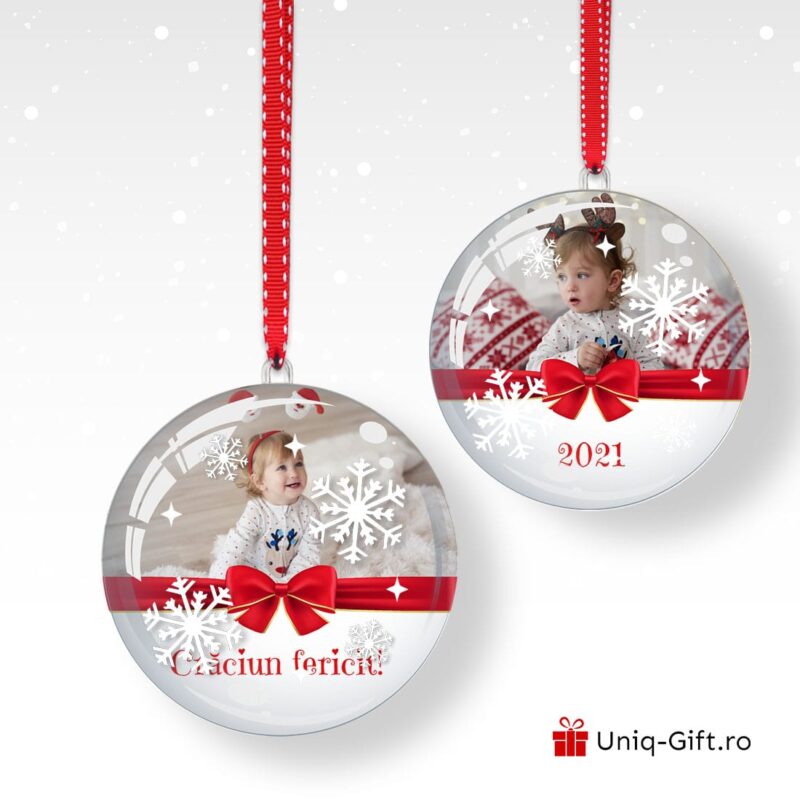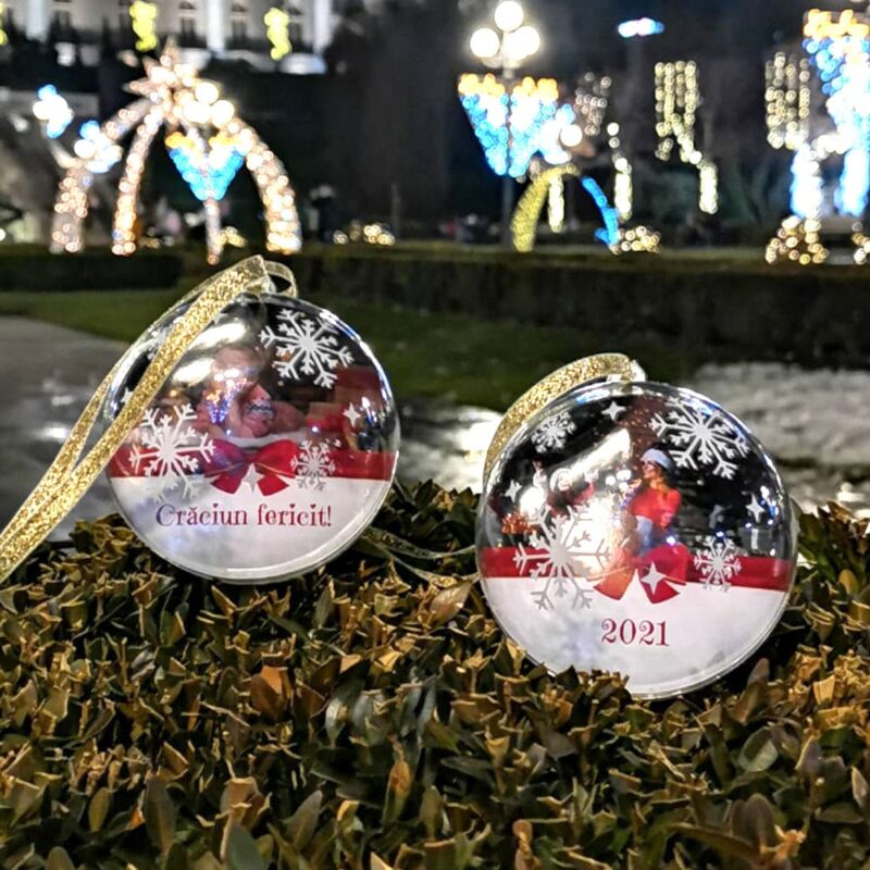 Glob de Craciun imprimat cu fulgi de nea pe exterior ce poate fi personalizat cu 2 poze si 2 mesaje la alegere. Un cadou minunat si cu adevar unic, ce va ajunge in inima celor ce-l vor primi. Nu-i uita pe cei dragi si ofera-le un cadou creat chiar de tine. Il poti oferi personal dar il putem trimite chiar noi la adresa dorita. Acest produs poate fi comercializat doar pe uniq-gift.ro.